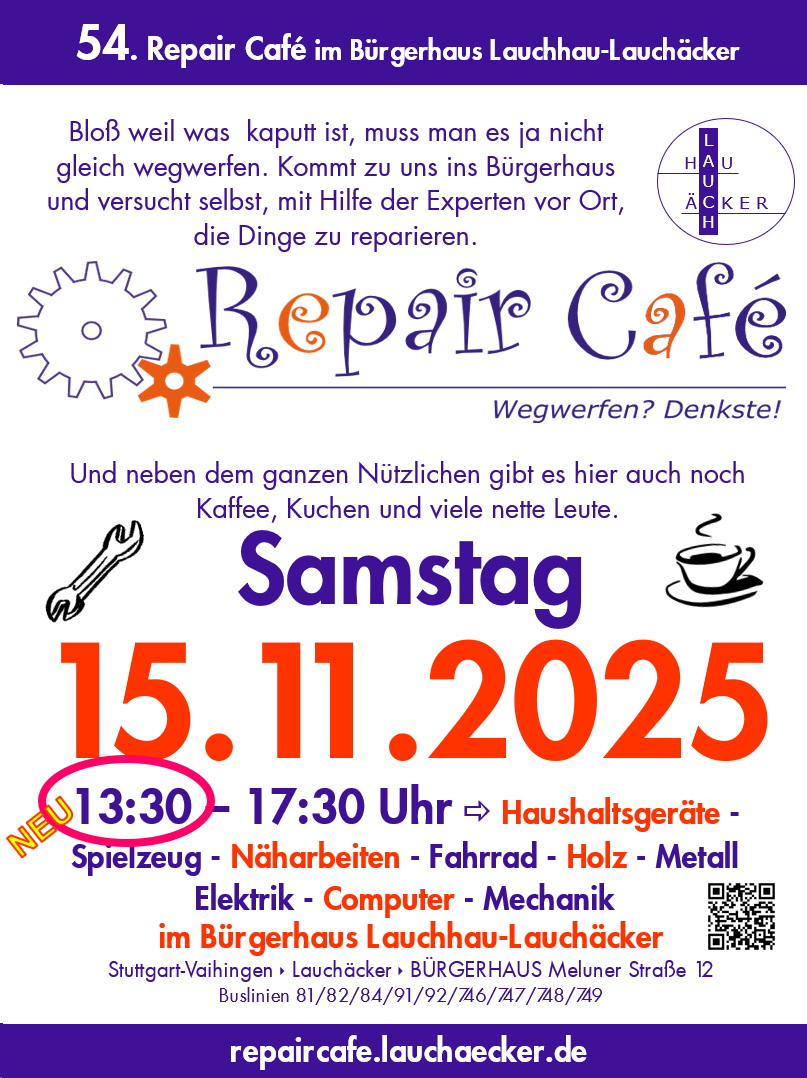 54. REPAIR CAFE Lauchhau-Lauchäcker im Bürgerhaus (STZ) Meluner Str. 12 Einlass: 13:30 Uhr Letzter Einlass: 17:30 Uhr